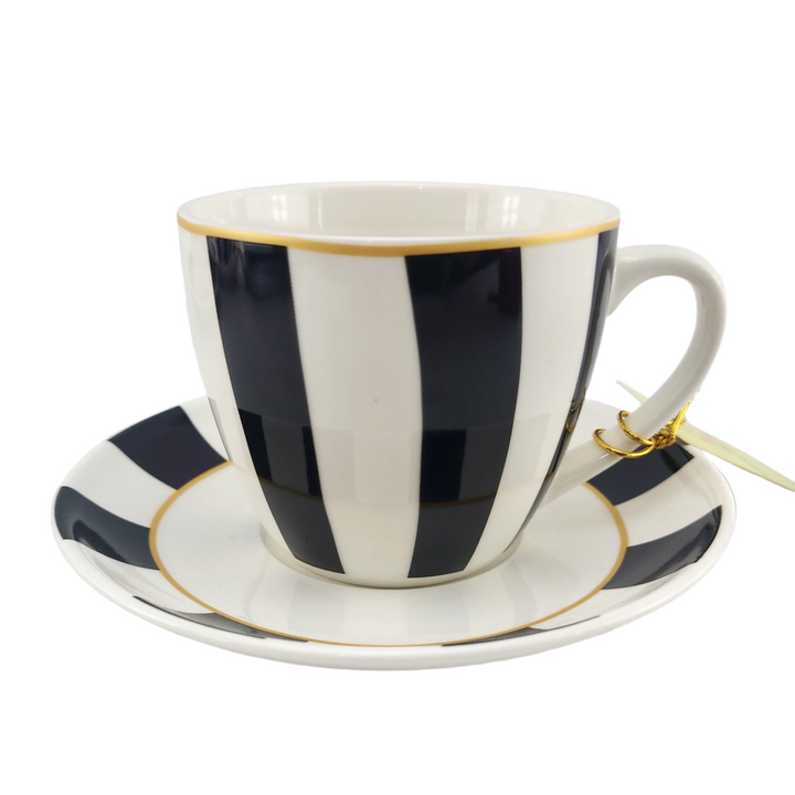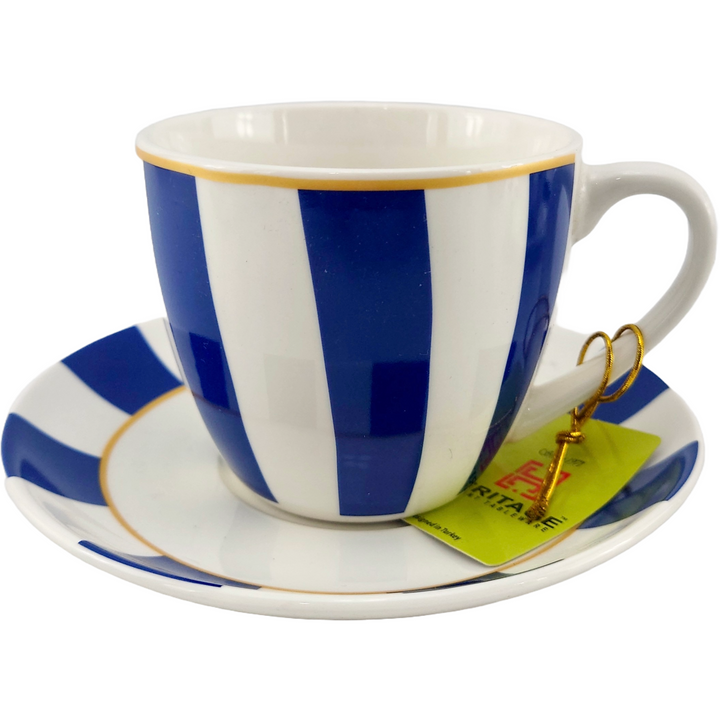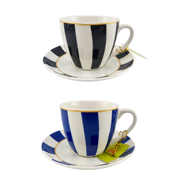 Heritage Striped Tea Cup & Saucer Set | Black & Blue | 6 pc